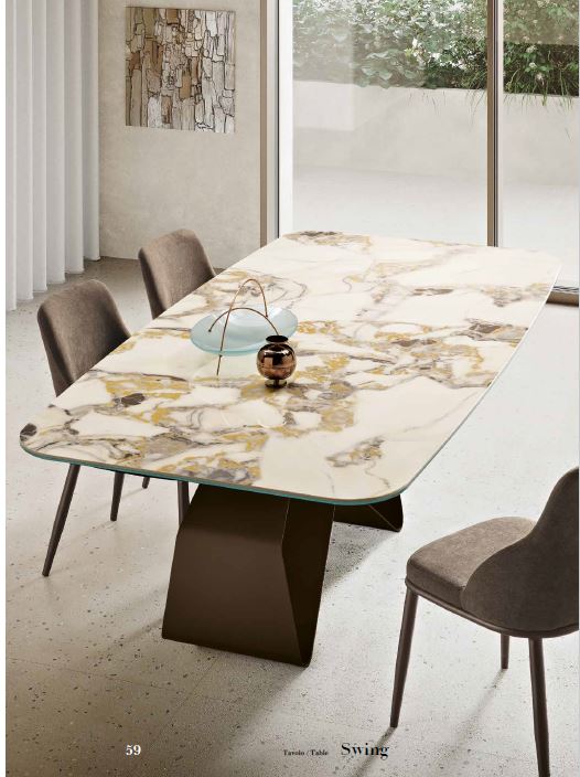 Swing è un tavolo che gioca con i contrasti tra leggerezza visiva e solidità strutturale. Il basamento in metallo verniciato,