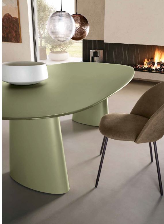 Tavolo fisso con base in MDF verniciato e piano in vetro. Disponibile in tre colori.