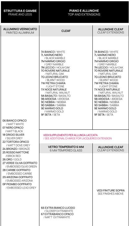 DISPONIBILE SU RICHIESTA CON MAGGIORAZIONE ANCHE CON PIANO VETRO BIANCO LUCIDO OD OPACO CON ALLUNGHE IN CLEAF O LACCATA