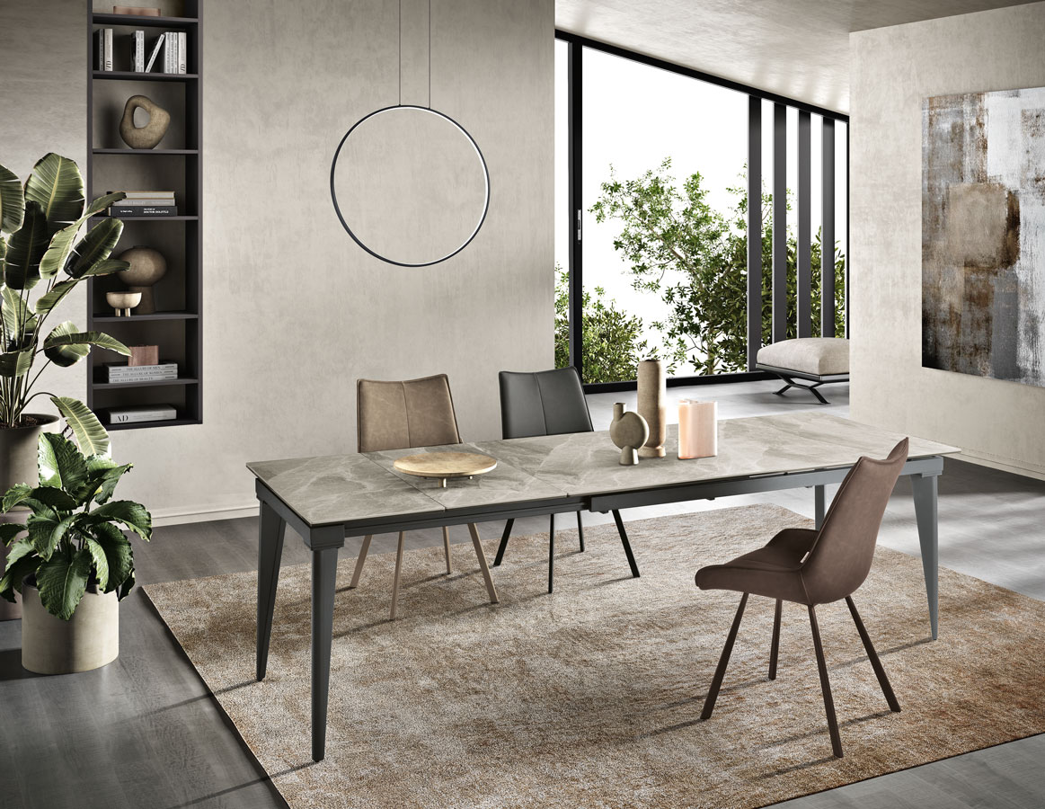 Tavolo allungabile telescopico con base in metallo verniciato e top in grès porcellanato