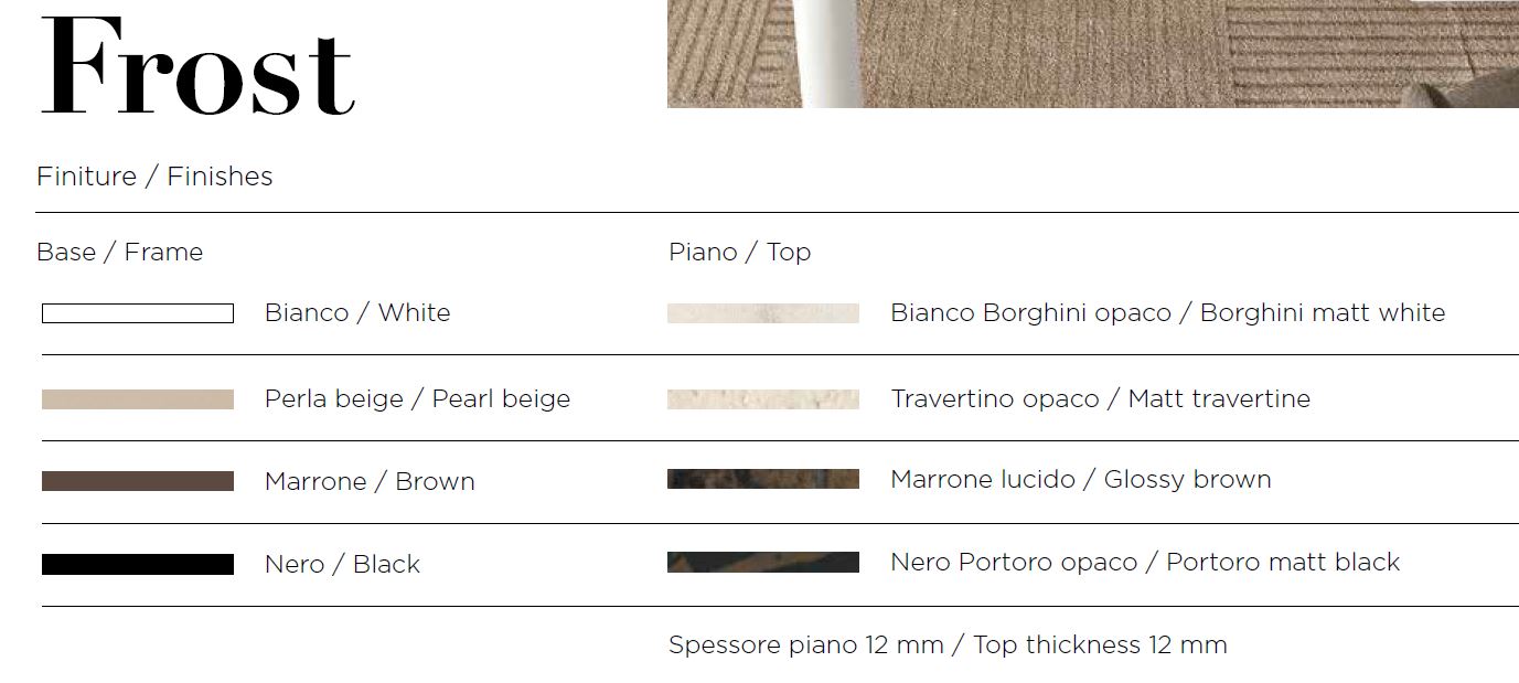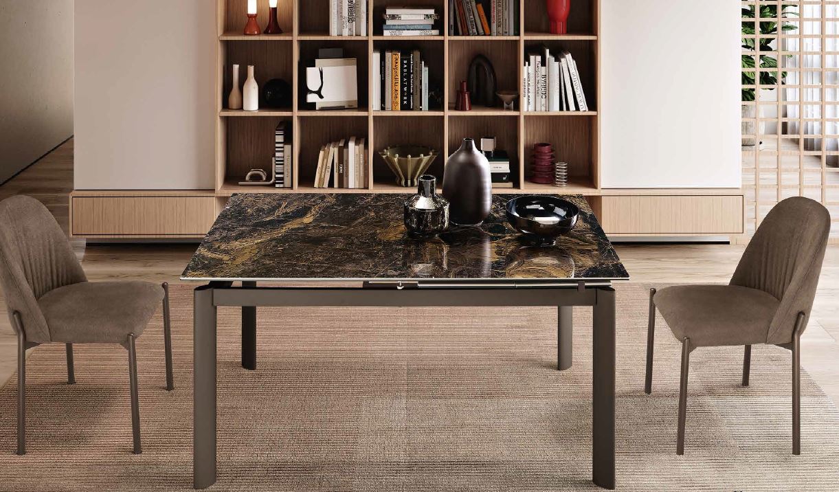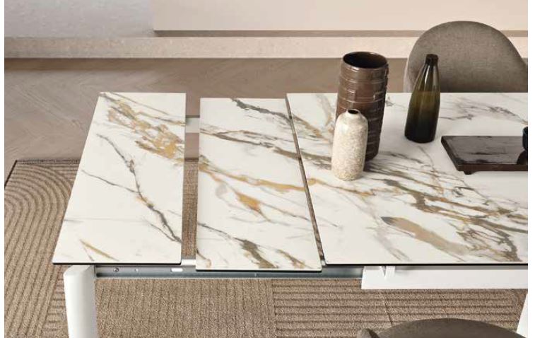 Frost è un tavolo allungabile dal design essenziale, pensato per un uso quotidiano e versatile. La struttura in metallo verniciato sostiene un piano in grès porcellanato effetto marmo, disponibile in diversi colori. Le gambe, posizionate agli