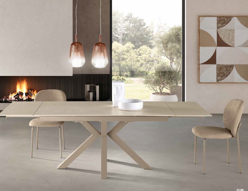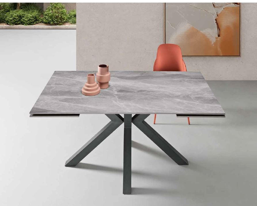 Tavolo allungabile con 2 allunghe laterali da 40 cm. Base in metallo verniciato e piano in pietra sinterizzata effetto marmo.