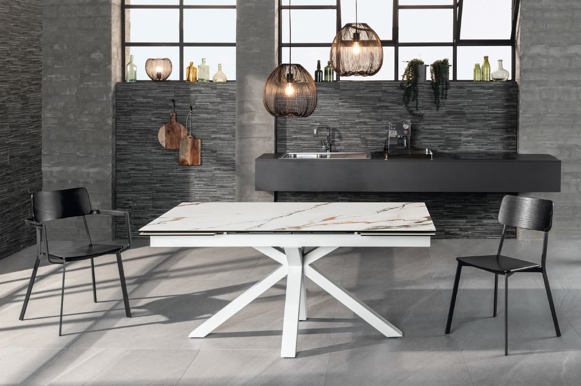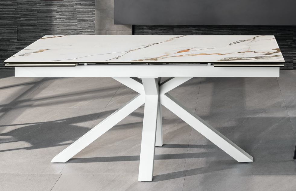 Tavolo allungabile con top in ceramica marmo Calacatta Borghini OPACO. Base in metallo verniciato bianco.