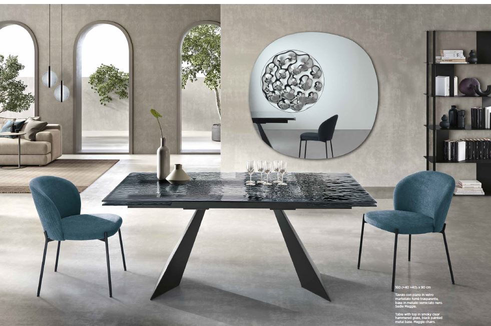 Waters è un tavolo allungabile che esalta il contrasto tra l’essenzialità del metallo e la raffinatezza del vetro. Il
