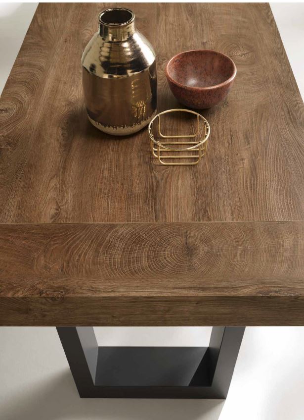 Tavolo allungabile con struttura, piano ed allunghe in laminato effetto legno. Due allunghe laterali da 50 cm.