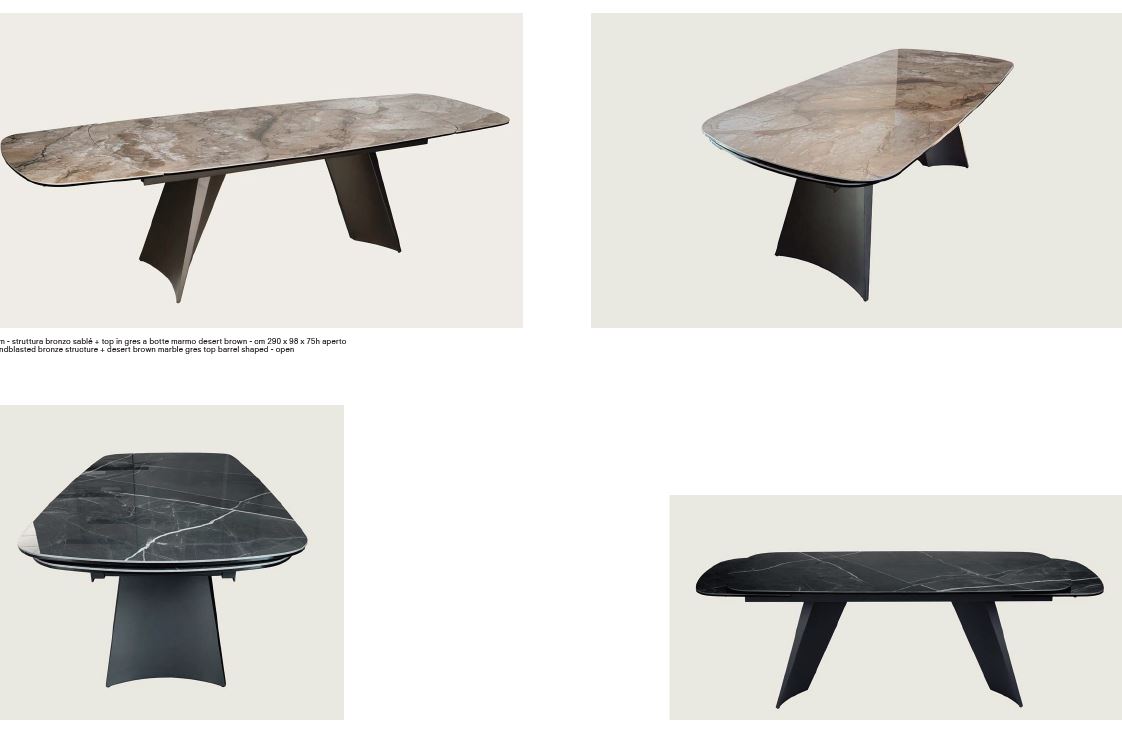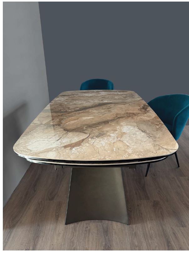 Glam è uno splendido tavolo allungabile dalla sagoma a botte caratterizzato da top in gres lucido ed una struttura a due gambe estremamente ricercata. Le gambe, uniche nel suo genere, sono realizzate con uno scatolato in solida lamina d’acciaio creato dalla combinazione di tre curve ad ampio raggio, verniciate a polveri epossiche con finitura sablé, e si sposa perfettamente con i sofisticati top in gres 6 mm accoppiato a vetro fumé temperato da 10 mm. Le misure di questo tavolo sono decisamente importanti. Chiuso misura 200 x 98 cm ed aperto con 2 allunghe da 45 cm cadauna raggiunge i 290 cm di lunghezza. Disponibile in 2 varianti colore, marmo lucido desert brown (dai toni caldi e ambarati) combinato a struttura bronzo sablé oppure marmo