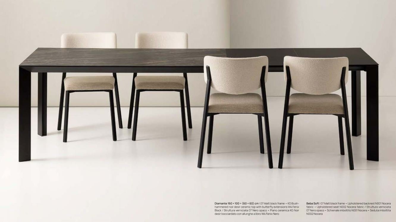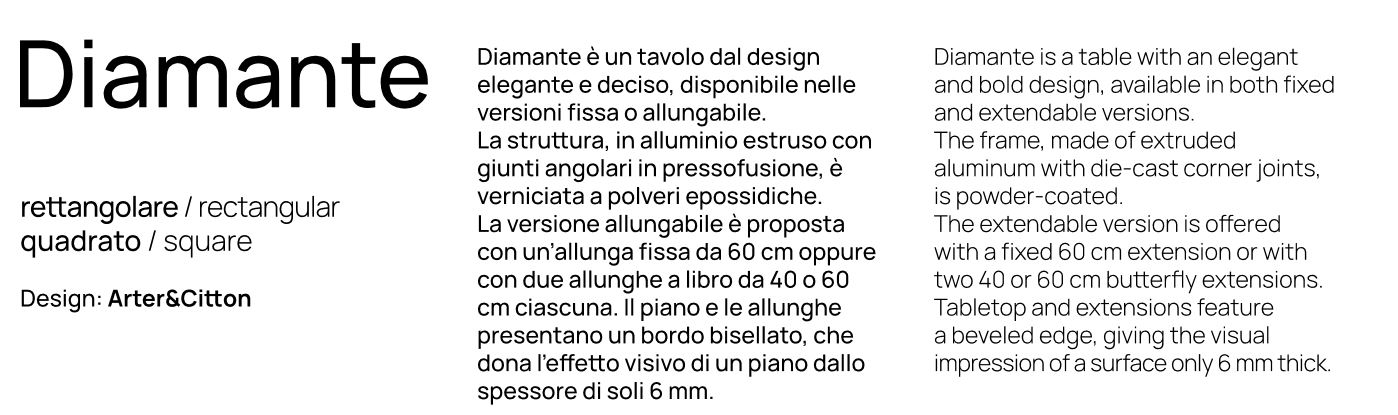DIAMANTE E' UN TAVOLO DAL DESIGN ELEGANTE E DECISO, DISPONIBILE NELLA VERSIONE FISSA O ALLUNGABILE.