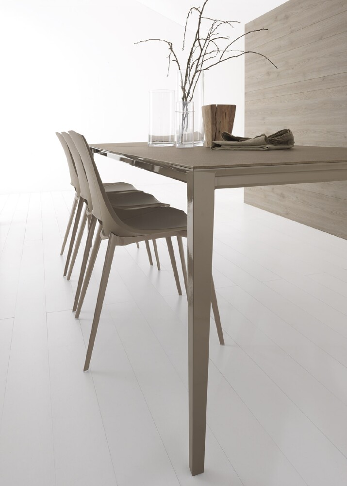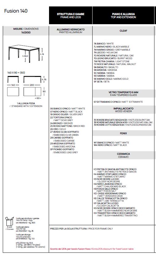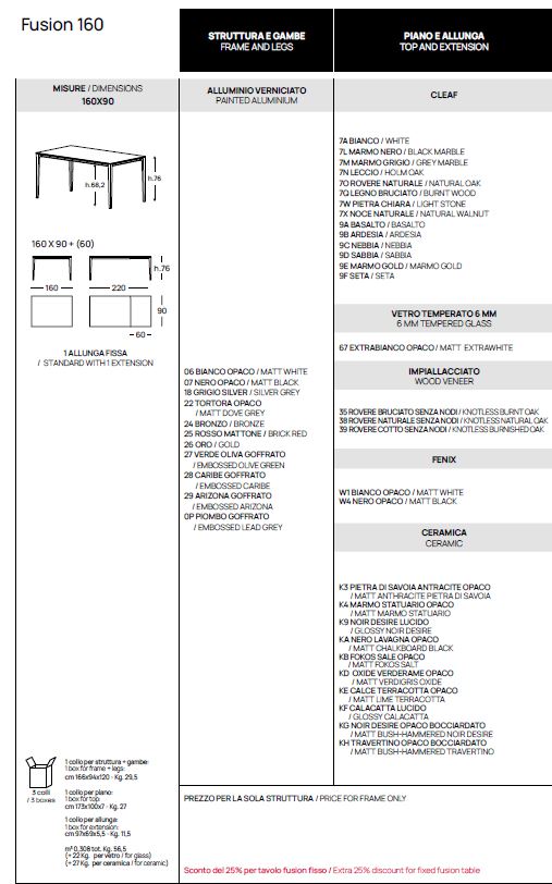 FUSION E' UN TAVOLO CHE UNISCE DESIGN E INGEGNERIA IN UN EQUILIBRIO PERFETTO. LA STRUTTURA E' COMPOSTA DA UN TELAIO DI ALLUMINIO ESTRUSO E GAMBE IN PRESSOFUSIONE DI ALLUMINIO, COLLEGATE DA ANGOLARI INTERNI IN LEGA DI ALLUMINIO, TELAIO E GAMBE SONO DISPONIBILI IN DIVERSE FINITURE VERNICIATE. IL PIANO E L'ALLUNGA PRESENTANO UN BORDO BISELLATO, CHE DONA L'EFFETTO VISIVO DI UN PIANO DALLO SPESSORE DI SOLI 6MM