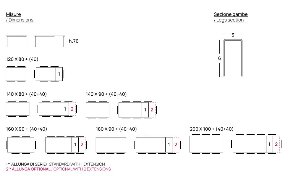 80X120 ALLUNGABILE 160, 80X140 ALLUNGABILE 180-220, 90X140 ALLUNGABILE 180-220 (SECONDA ALLUNGA OPTIONAL) 90X160 ALLUNGABILE 200-240, 90X180 ALLUNGABILE 220-260, 100X200 ALLUNGABILE 240-280.