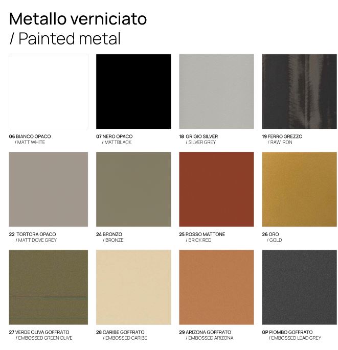 STRUTTURA METALLO VERNICIATO COLORI: BIANCO OPACO, NERO OPACO, GRIGIO SILVER, TORTORA OPACO, BRONZO, ROSSO MATTONE, ORO, VERDE OLIVA GOFFRATO, CARIBE GOFFRATO, ARIZONA GOFFRATO, PIOMBO GOFFRATO