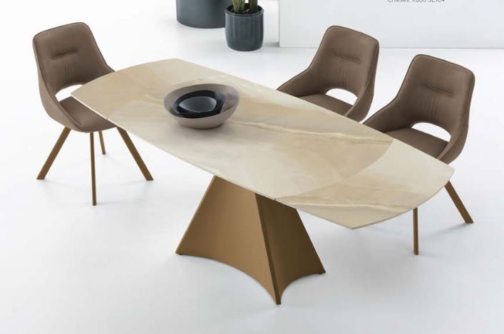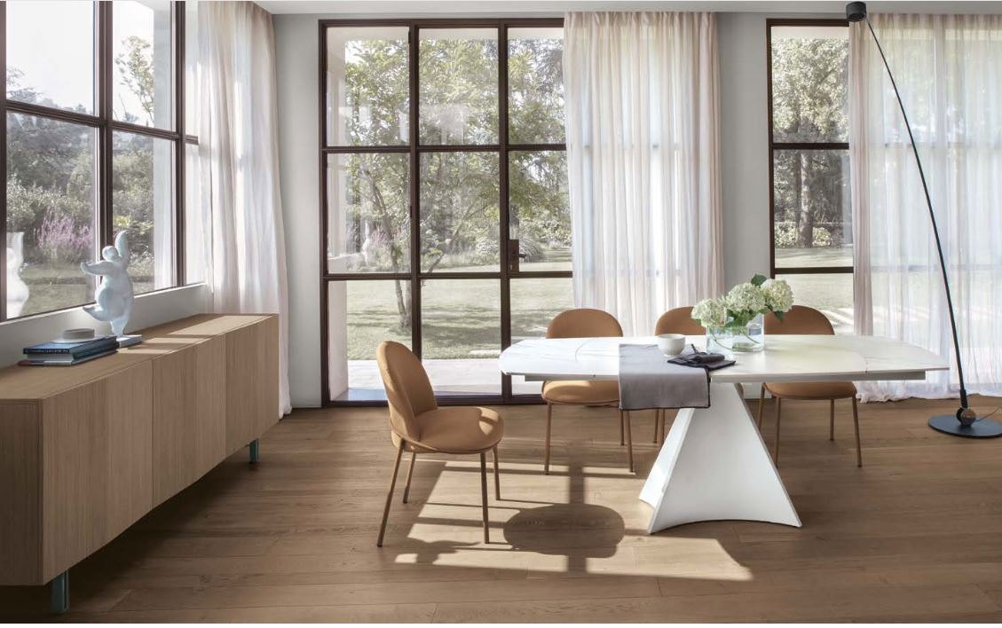 Tavolo allungabile con basamento centrale in metallo verniciato o spazzolato. Piano girevole e allunghe laterali a