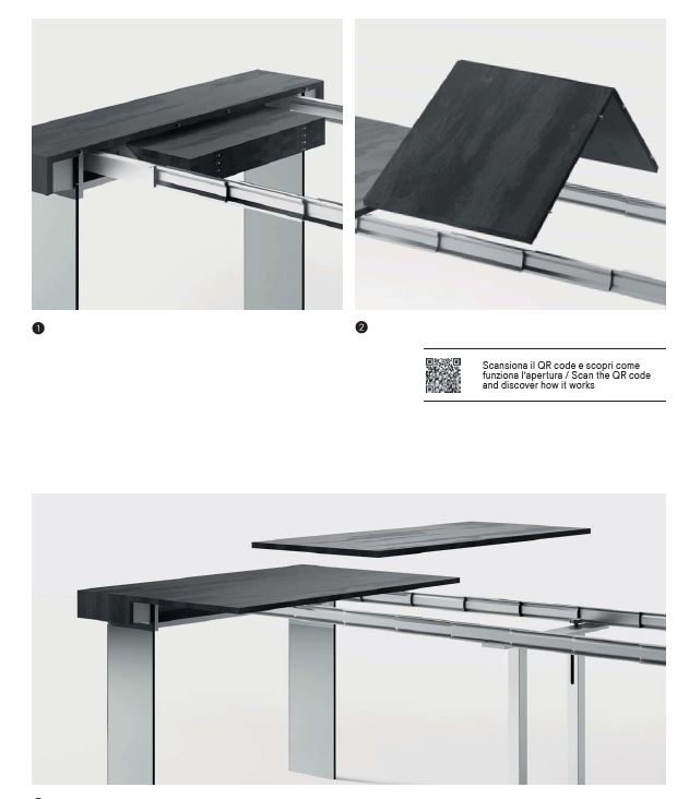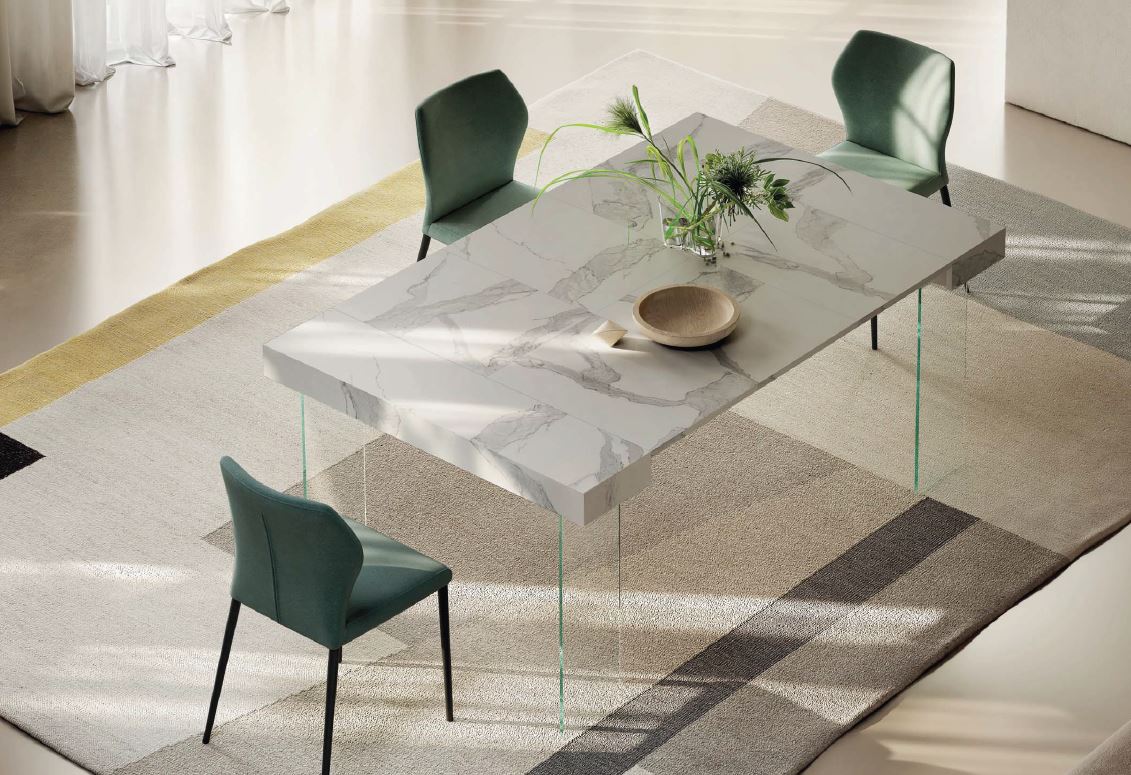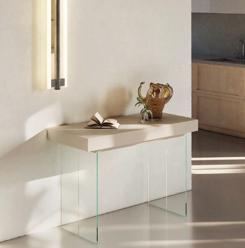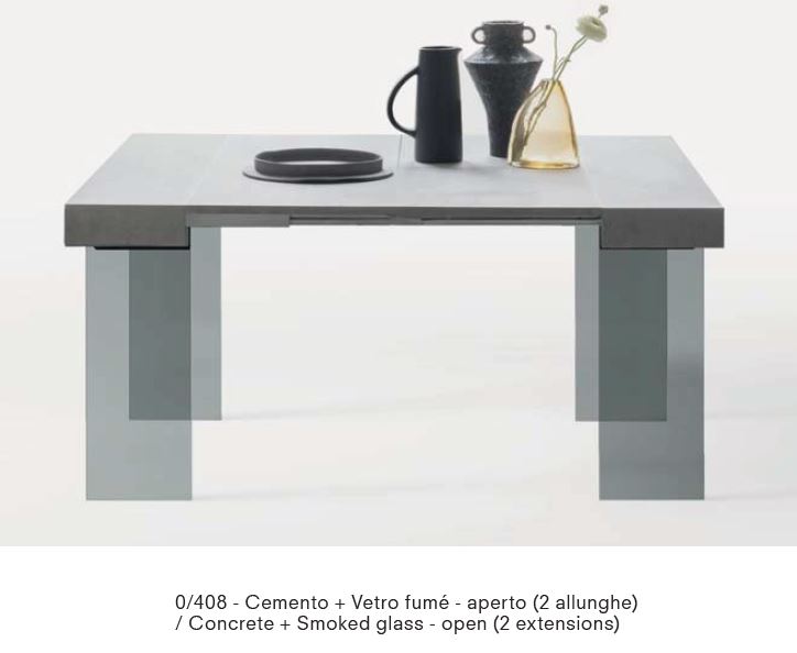 PREZZO QUI INDICATO VERSIONE CON 2 ALLUNGHE, FIANCHI VETRO TRASPARENTE PIANO IN BIANCO OPACO-SABBIA-GRIGIO TORTORA-GRIGIO ARDESIA