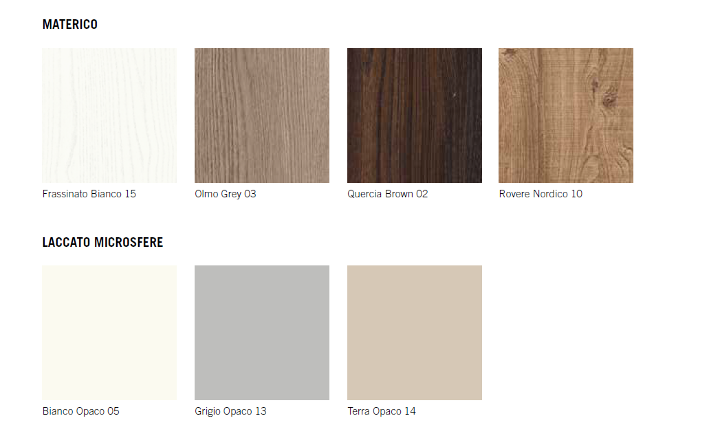 TOP, FIANCHI E CASSETTI SONO REALIZZATI CON PANNELLI NOBILITATI OLMO GREY, QUERCIA BROWN, FRASSINATO BIANCO DI SPESSORE 18MM
