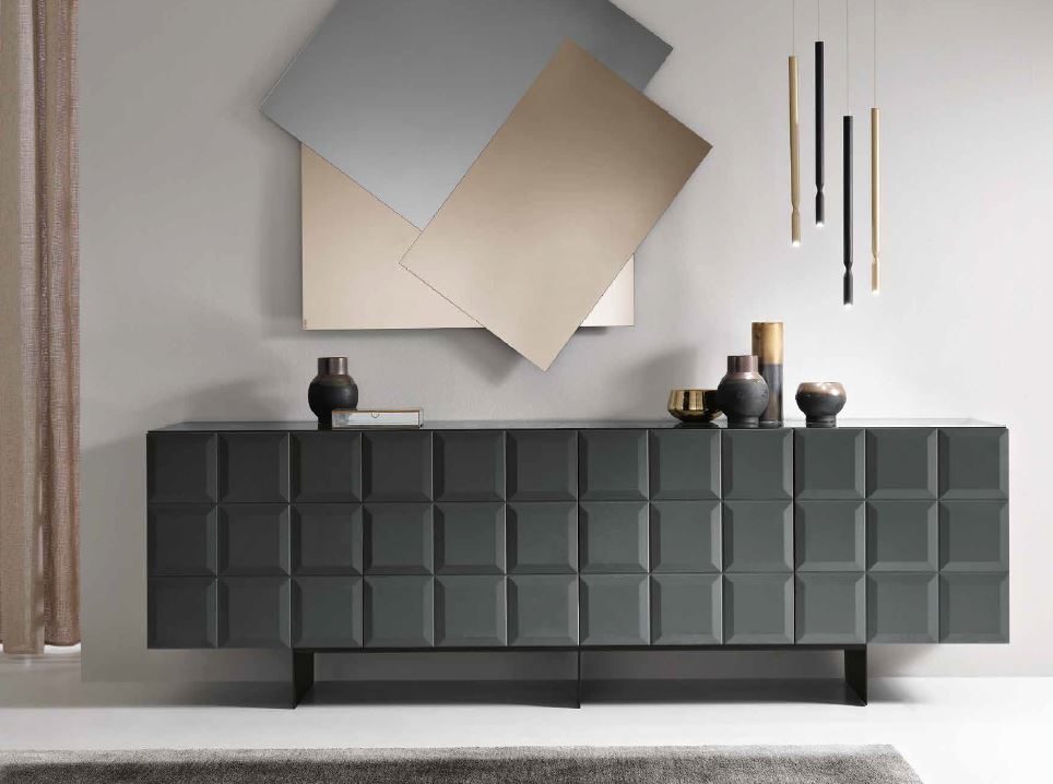 Ofelia è una madia che gioca con la geometria e conquista con il dettaglio. Le ante in MDF disegnano una griglia di rilievi quadrati, come una raffinata tavoletta di cioccolato, che dona ritmo e tridimensionalità alla superficie. La scocca in nobilitato ha come optional un top in vetro specchiato, bronzo o fumè, per aggiungere un tocco ancora più sofisticato. La base in metallo verniciato, proposta in tre varianti di forma, completa un arredo dalla personalità decisa e dal gusto contemporaneo.