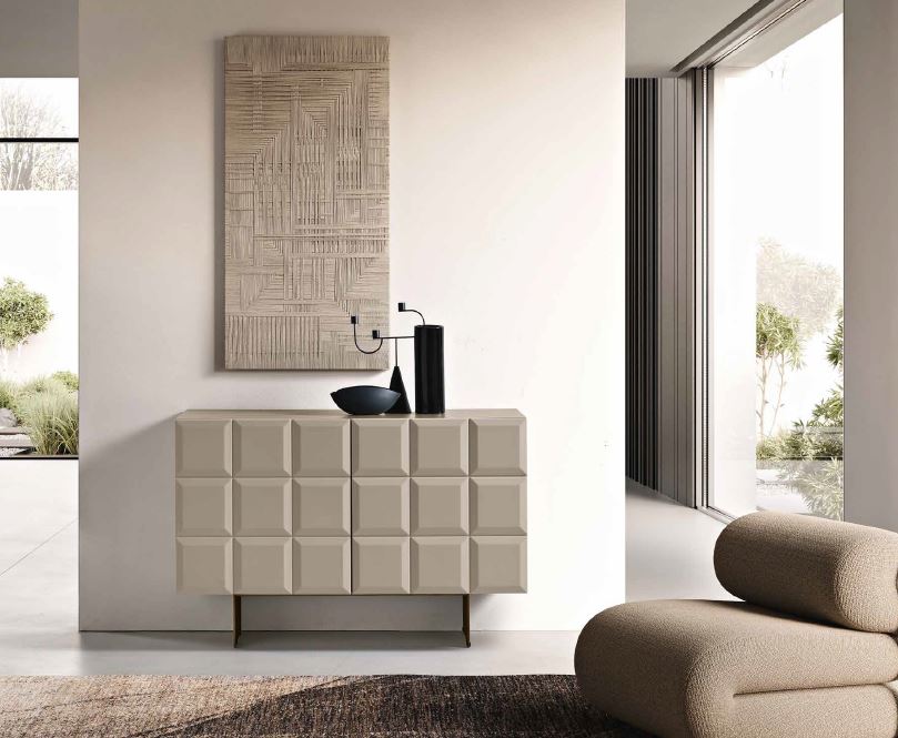 Ofelia è una madia che gioca con la geometria e conquista con il dettaglio. Le ante in MDF disegnano una griglia di rilievi quadrati, come una raffinata tavoletta di cioccolato, che dona ritmo e tridimensionalità alla superficie. La scocca in nobilitato ha come optional un top in vetro specchiato, bronzo o fumè, per aggiungere un tocco ancora più sofisticato. La base in metallo verniciato, proposta in tre varianti di forma, completa un arredo dalla personalità decisa e dal gusto contemporaneo.