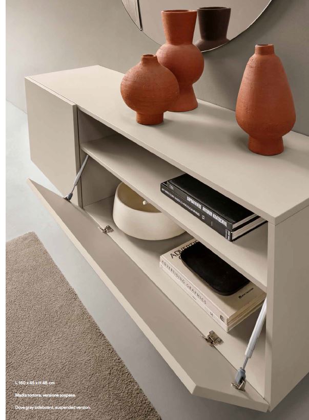 Madia in nobilitato dal design lineare, con un ampio vano a giorno dalla duplice funzione estetica e pratica. Lo spazio contenitivo è suddiviso tra un’anta a battente con ripiano centrale fisso e apertura push-pull e un’anta a ribalta con apertura a pistone. La madia offre una doppia configurazione: ancorata a parete nella versione sospesa oppure posizionata a