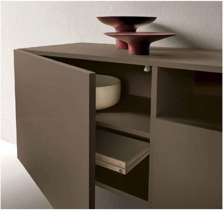 Melamine sideboard with a linear design with a large open compartment serving both aesthetic and practical purposes. The storage space is divided between a hinged door with a fixed central shelf and a push-pull opening system and a drop-down door with a piston opening system. The sideboard offers two configurations: anchored to the wall in the wall-mounted version or positioned on the floor with five triangular black ABS feet. Available in three matte finishes