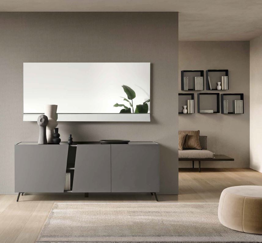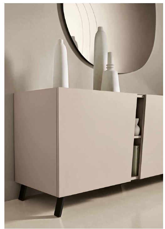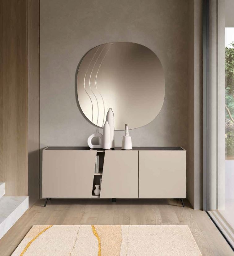 Melamine sideboard with three hinged doors, embellished with an elegant optional mirrored top. The four fixe internal shelves create practical and functional storage compartments, while the two slanted doors create a welcoming open compartment.