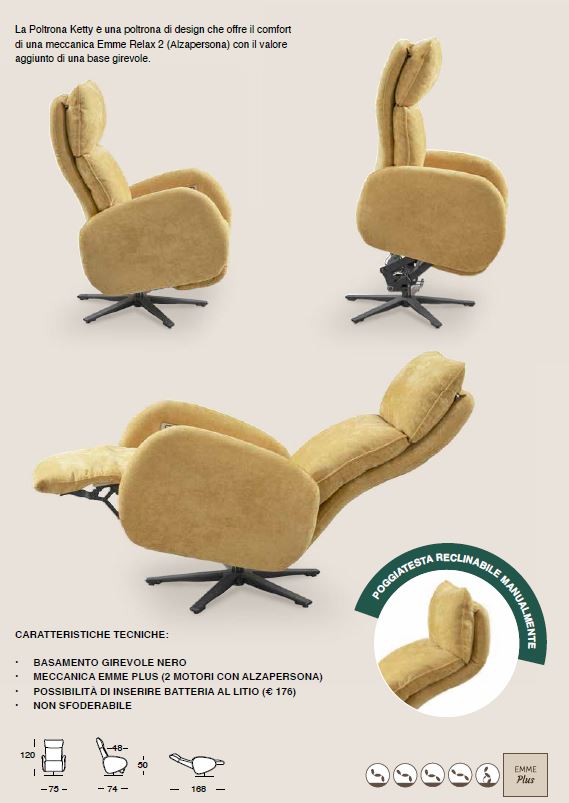 La Poltrona Ketty è una poltrona di design che offre il comfort di una meccanica Emme Relax 2 (alzapersona) con il valore aggiunto di una base girevole