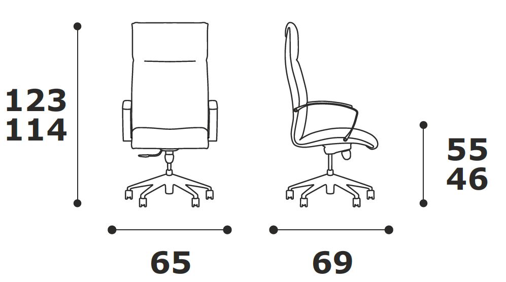 Caratteristiche generali: Poltrona direzionale, con braccioli in acciaio cromato con la parte superiore imbottita e rivestita, realizzata con struttura monoscocca in multistrato di pioppo e faggio mm 12, imbottitura sedile e schienale in poliuretano espanso di alta densità, meccanismo oscillante 5 posizioni, pompa a gas per la regolazione in altezza della stessa in acciaio cromato, base cinque razze diametro mm 700 in alluminio e doppie ruote diametro mm 65 con battistrada gommato.