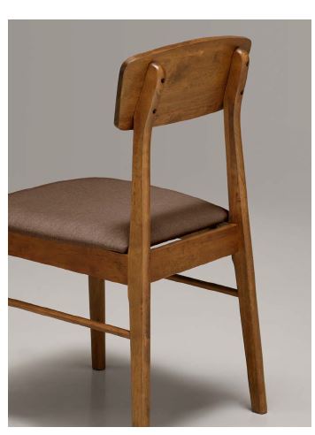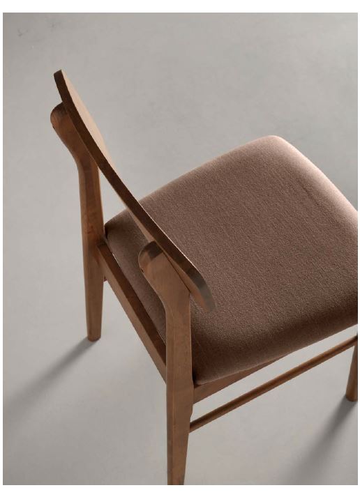Sedia con struttura in impiallacciato, schienale curvo e seduta imbottita in tessuto. Disponibile in diversi colori