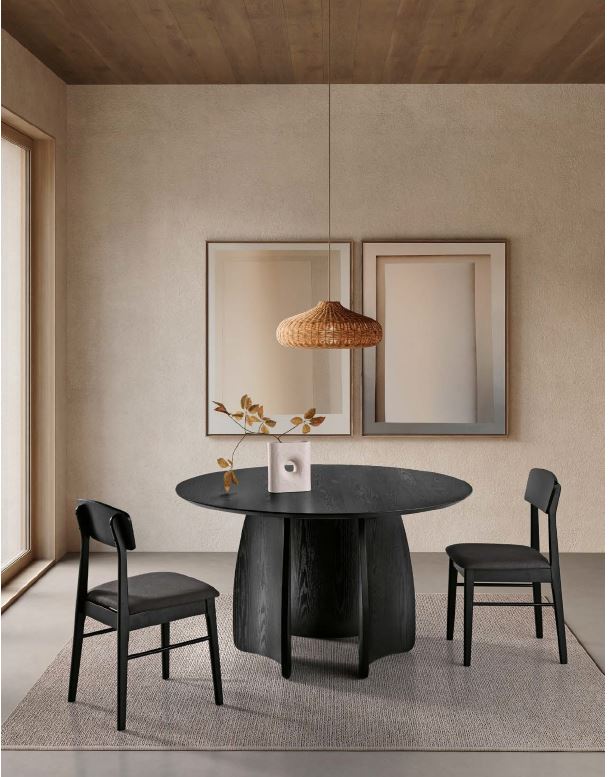 Sedia con struttura in impiallacciato, schienale curvo e seduta imbottita in tessuto. Disponibile in diversi colori