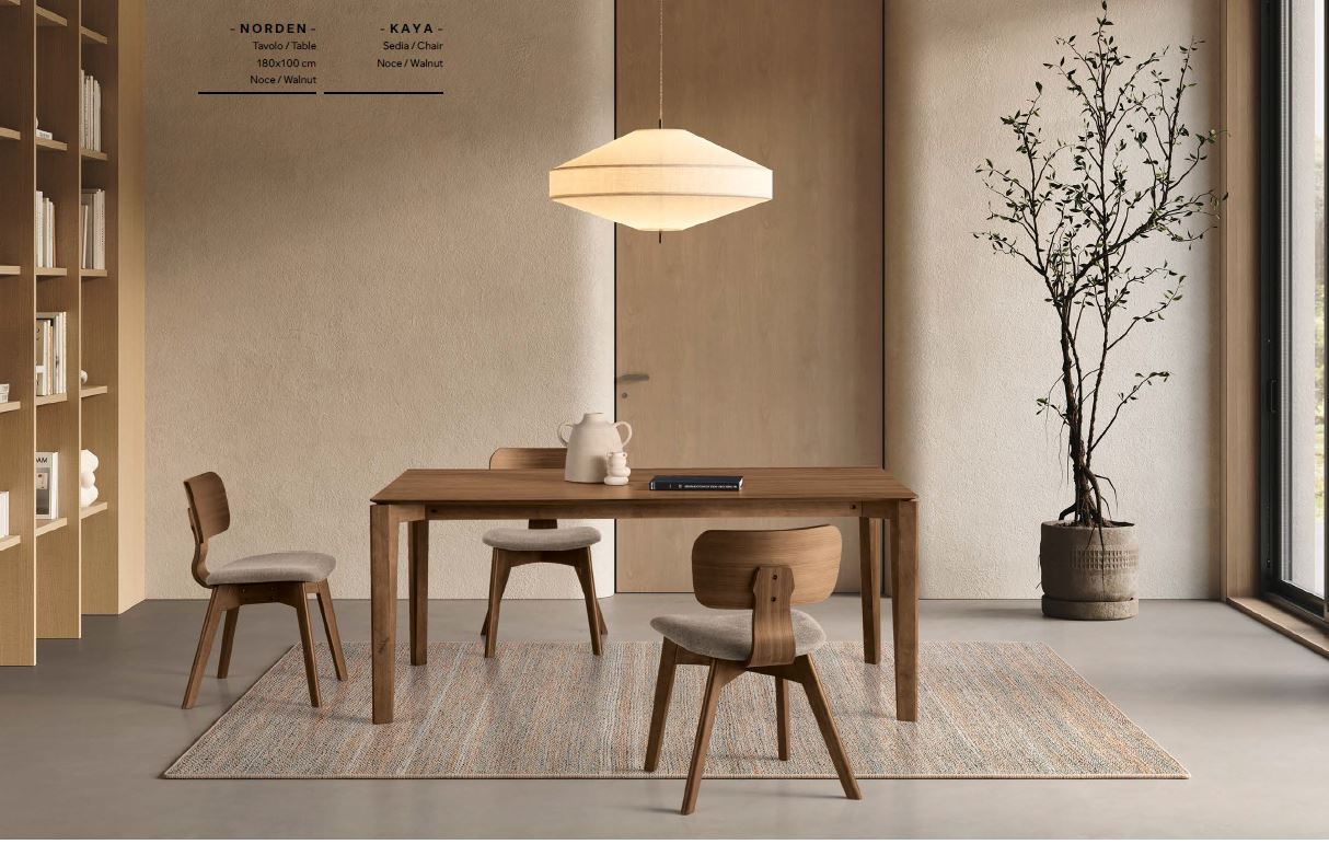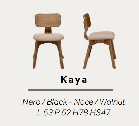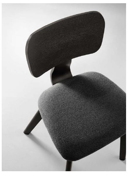 Sedia con struttura in impiallacciato, schienale curvo e seduta imbottita in tessuto. Disponibile in due colori