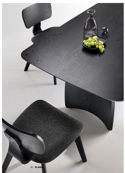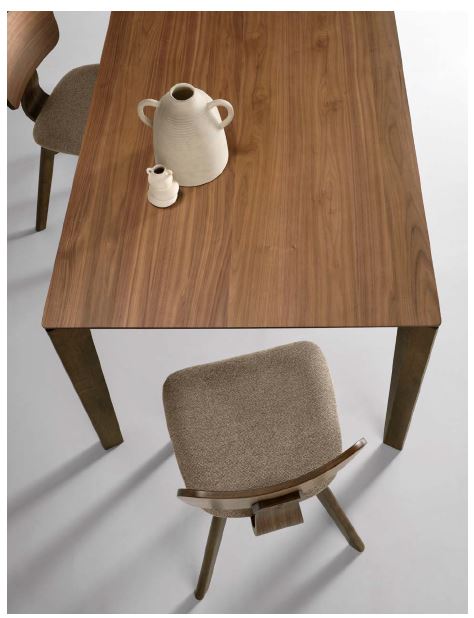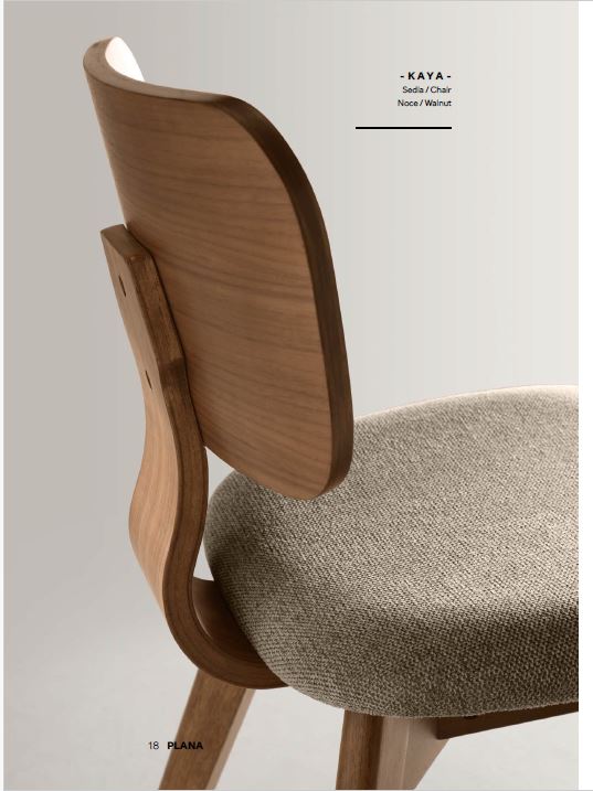 Sedia con struttura in impiallacciato, schienale curvo e seduta imbottita in tessuto. Disponibile in due colori
