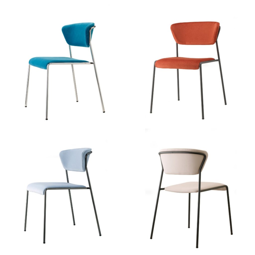 Seduta e schienale imbottiti con anima in multistrato curvato. Struttura a 4 gambe in acciaio tubolare ø mm 16. Impilabile.