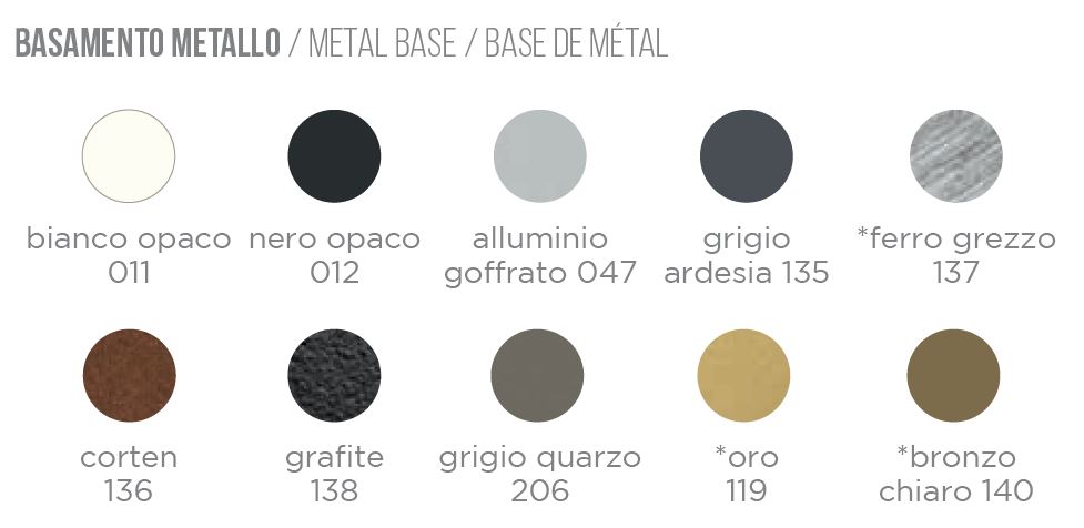 BASAMENTO METALLO FINITURE: BIANCO OPACO 011, NERO OPACO 012, ALLUMINIO GOFFRATO 047, GRIGIO ARDESIA 135