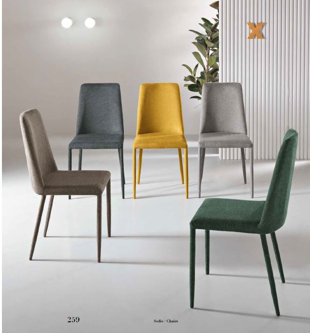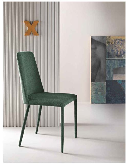 Sedia imbottita in tessuto. Gambe rivestite in tessuto. Disponibile in diversi colori.