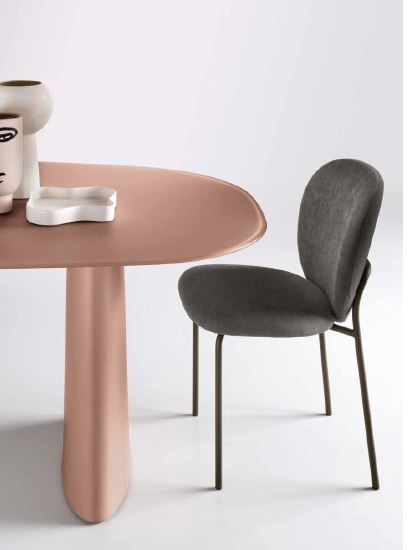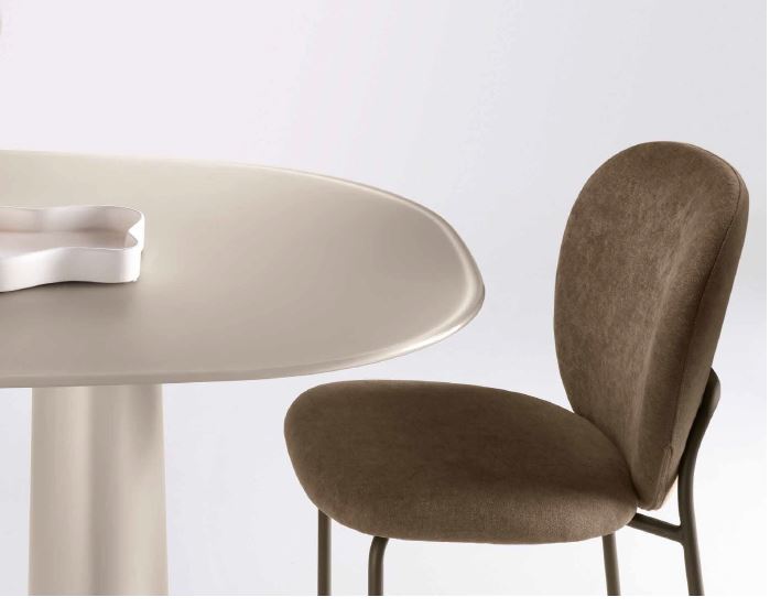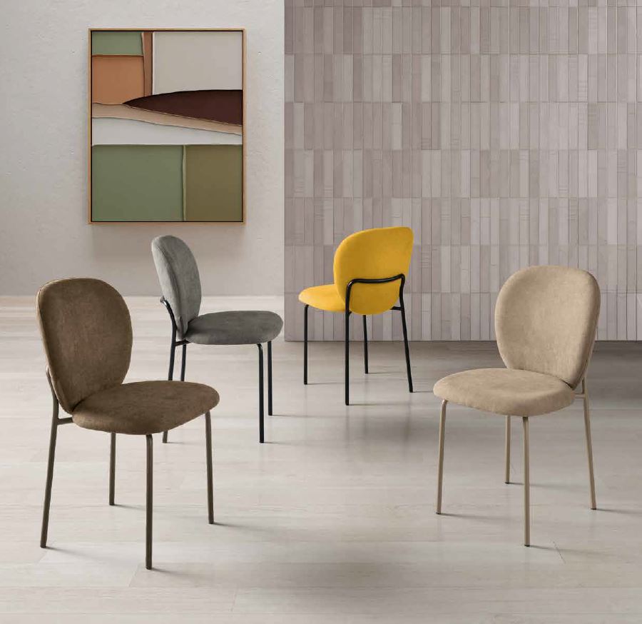 Sedia in tessuto con imbottitura e struttura in metallo verniciato.