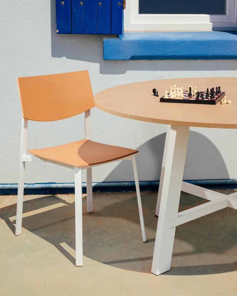 Struttura in metallo con sezione rettangolare e tappo in polipropilene che nasconde il punto di fissaggio dello schienale con la struttura. Seduta e schienale in polipropilene riciclato post-industriale, disponibile in varie colorazioni, con tappi sul retro dello schienale e piedini abbina bili, colori come seduta-schienale. Nella collezione è presente anche lo sgabello h 65 cm - h 75 cm. Sedia e sgabello sono impilabili."
