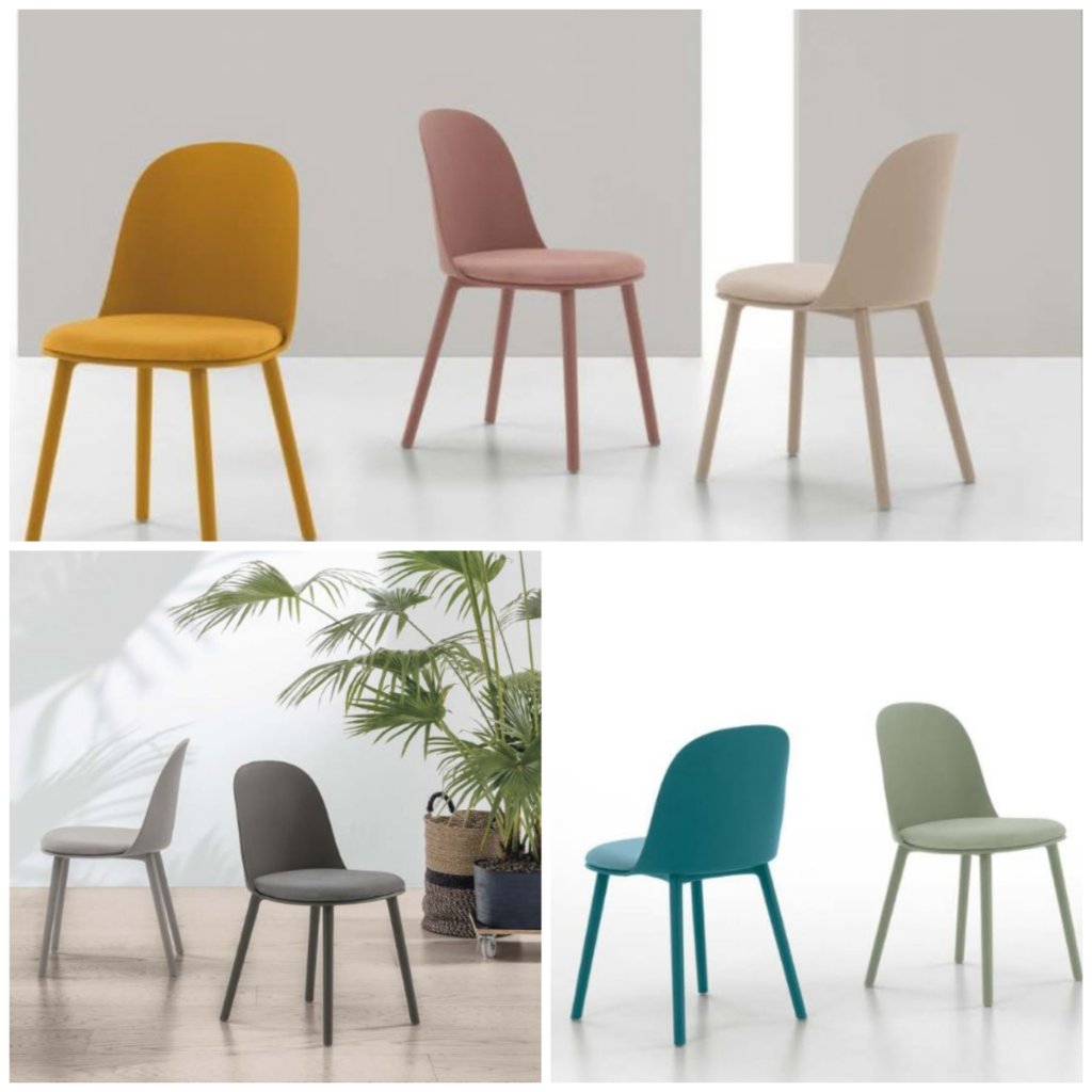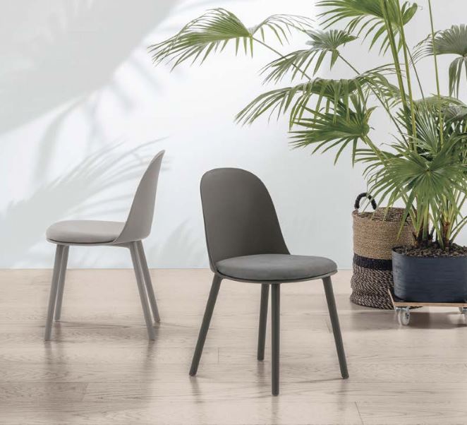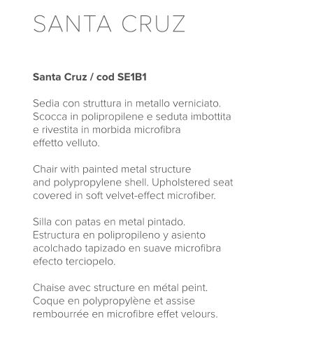 Sedia con struttura in metallo verniciato. Scocca in polipropilene e seduta imbottita e rivestita in morbida microfibra effetto velluto.
