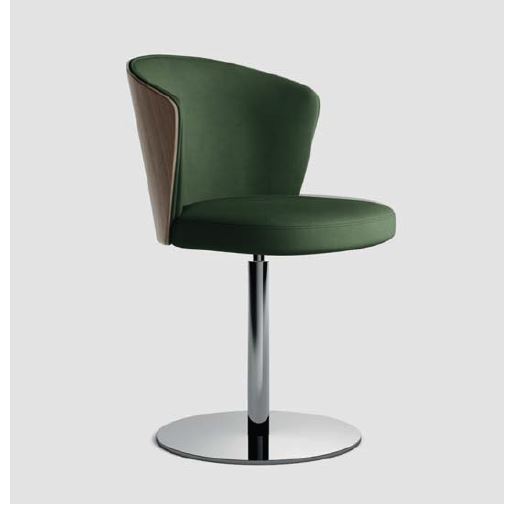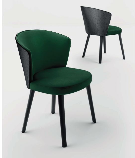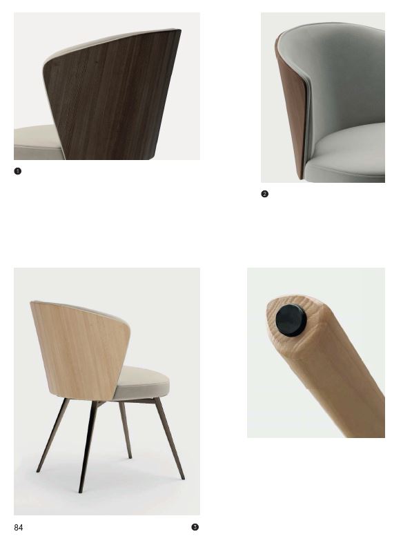 Questa elegante poltroncina offre sorprendenti combinazioni di stile. La seduta può essere abbinata alla nuova base in legno massello di frassino con gamba coni- cromate, incluse versioni sgabello. Sedile e schienale sono realizzati in legno multistrato di betulla, imbottiti con spugna di poliuretano espanso ad alta densità e ricoperti a scelta con una ampia gamma di tessuti, vera pelle o similpelle. La base in legno ed il retro a vista dello schienale in multistrati impiallacciato frassino , sono disponibili con le finiture: naturale, noce, rovere bruciato o nero venato