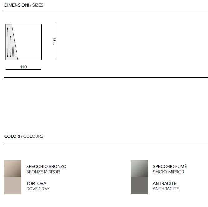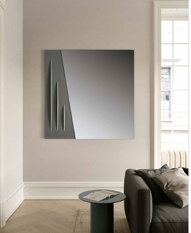 Specchio dalla forma quadrata con inserto verniciato effetto cemento, realizzato interamente in vetro, proposto in un’unica dimensione e due differenti colori.