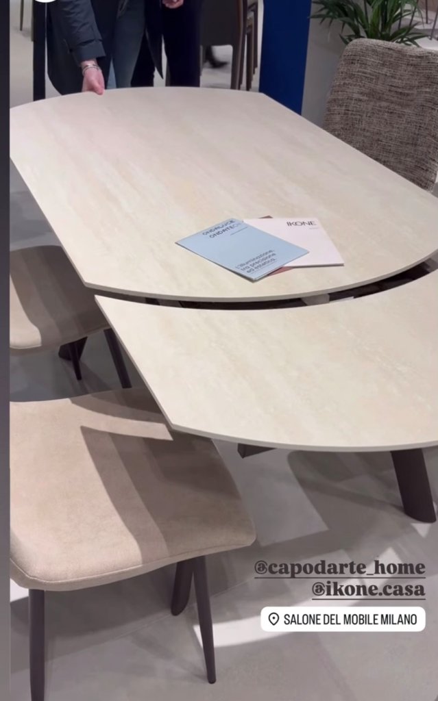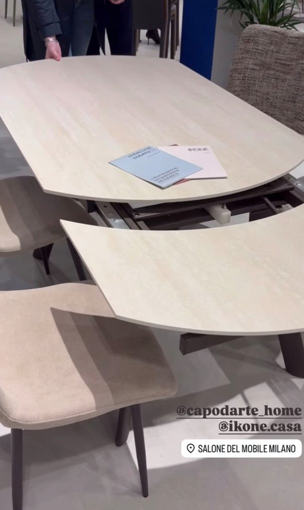 Tavolo allungabile con un’allunga laterale da 40 cm. Base in metallo verniciato e piano in pietra sinterizzata effetto marmo.