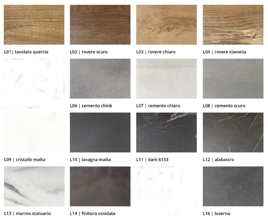 FINITURE: TERRA, NOCE 02, CILIEGIO, OLMO NEUTRO, ROVERE 02, ROVERE 03, ROVERE NATURALE, ROVERE SIGARO, ROVERE GRIGIO, ROVERE WENGHE'