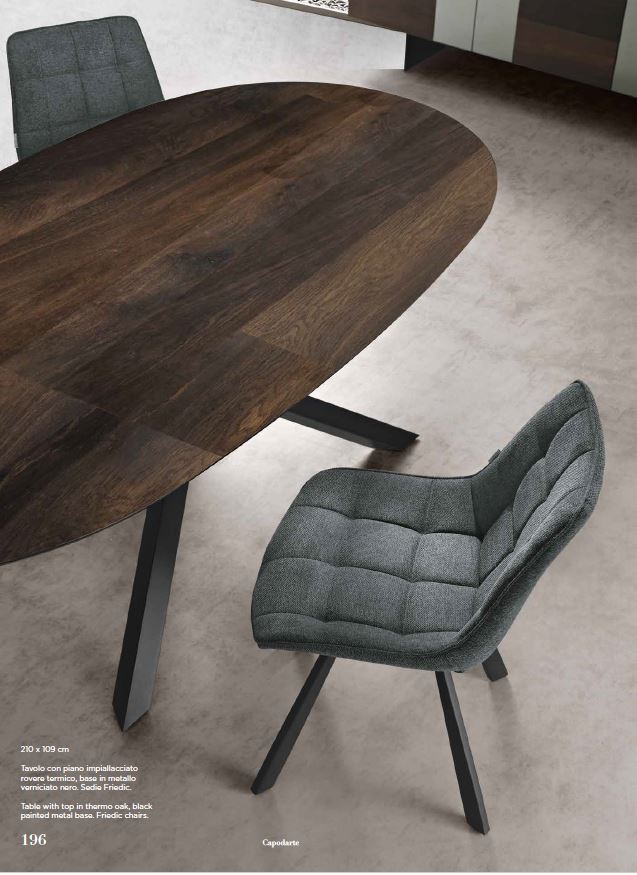 in rovere impiallacciato, caldo e materico, si distingue per il profilo arrotondato che invita alla convivialità e ammorbidisce l’impatto visivo.