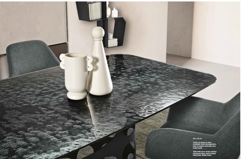 in apparenza, che richiama elementi architettonici e dona al tavolo una forte identità decorativa. Il piano è disponibile in diverse finiture, pensate per adattarsi a gusti e ambienti differenti dal vetro liscio, essenziale e minimale, al vetro rigato