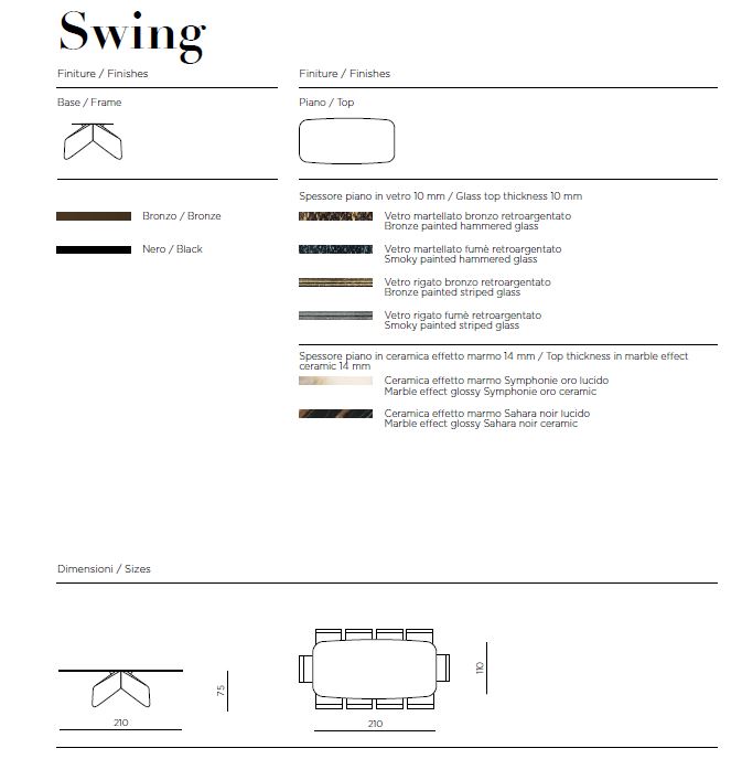 Swing è un tavolo che gioca con i contrasti tra leggerezza visiva e solidità strutturale. Il basamento in metallo verniciato,