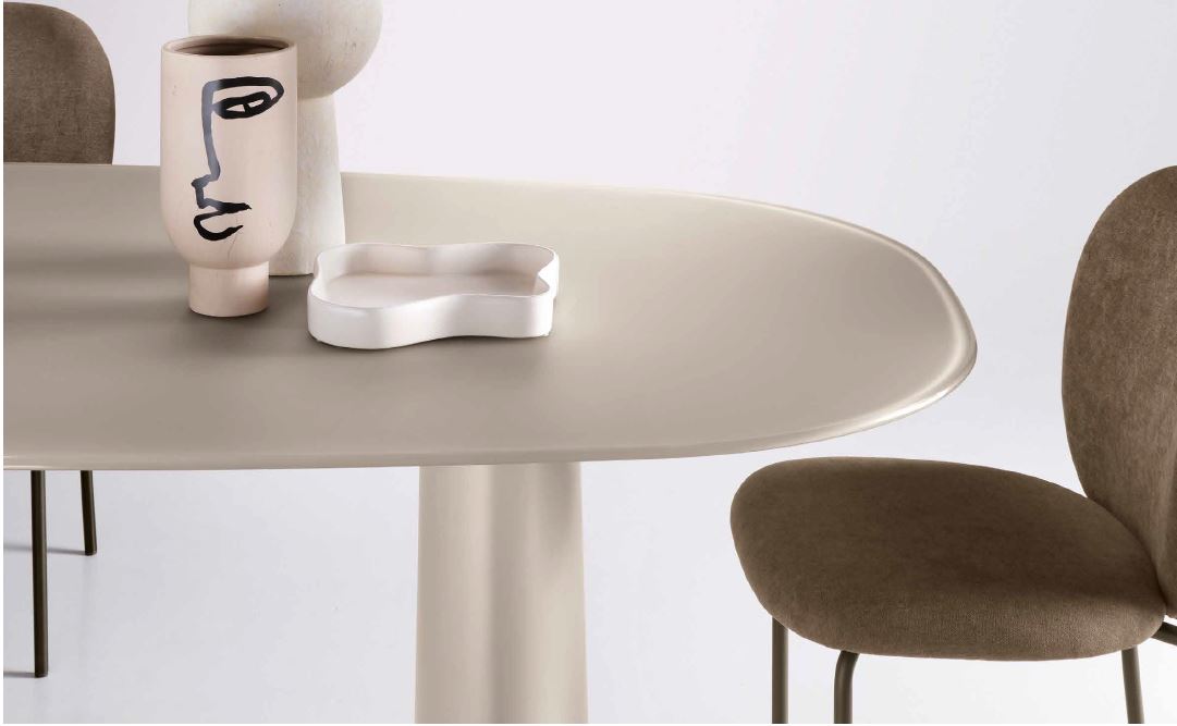 Tavolo fisso con base in MDF verniciato e piano in vetro. Disponibile in tre colori.