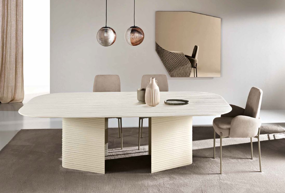 Tavolo con base e piano in vetro rigato verniciato.Table with base and top in painted striped glass.DIMENSIONI / SIZES240 x 120 x H 77 cm