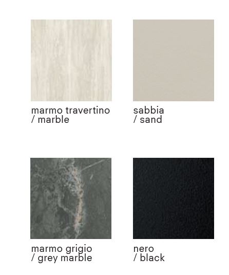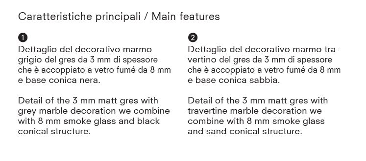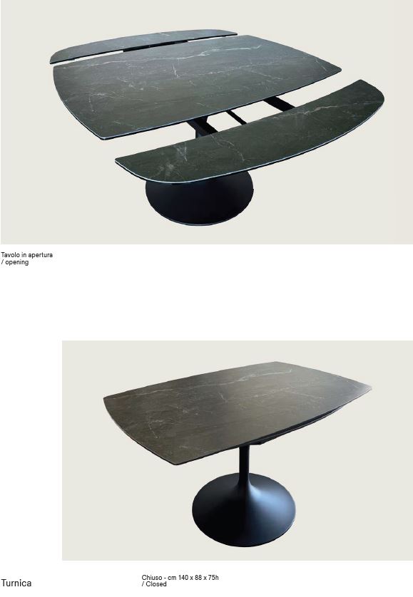 Turnica è un tavolo allungabile originale nella forma che si trasforma con la semplice rotazione del top. Chiuso il top è rettangolare con sagoma a botte e con un movimento arrotondati. La stabilità del tavolo è garantita dalla base centrale in acciaio ad alto spessore verniciata con polveri epossidiche cotte a forno ad alte temperature. Il top e le allunghe (che quando il tavolo è chiuso rientrano sotto il top) sono costituite da gres da 3 mm di spessore accoppiato a vetro fumé da 8 mm. Il gres è disponibile con 2 decori marmo: Travertino e Grigio. Chiuso misura 140 x 88 cm ed aperto 140 x 140 cm, passando da 6 a 8 persone.