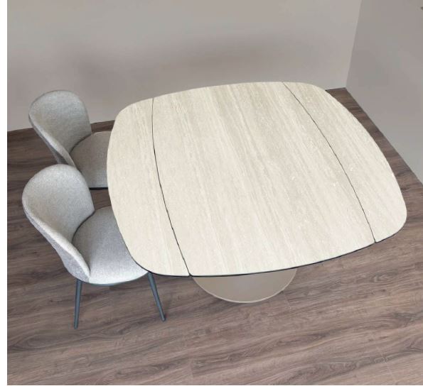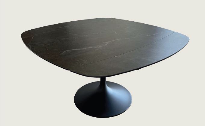 Turnica è un tavolo allungabile originale nella forma che si trasforma con la semplice rotazione del top. Chiuso il top è rettangolare con sagoma a botte e con un movimento arrotondati. La stabilità del tavolo è garantita dalla base centrale in acciaio ad alto spessore verniciata con polveri epossidiche cotte a forno ad alte temperature. Il top e le allunghe (che quando il tavolo è chiuso rientrano sotto il top) sono costituite da gres da 3 mm di spessore accoppiato a vetro fumé da 8 mm. Il gres è disponibile con 2 decori marmo: Travertino e Grigio. Chiuso misura 140 x 88 cm ed aperto 140 x 140 cm, passando da 6 a 8 persone.