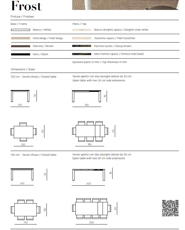 due allunghe da 30 cm, pronte ad ampliare la superficie quando serve. Proposto in due misure, Frost unisce funzionalità e