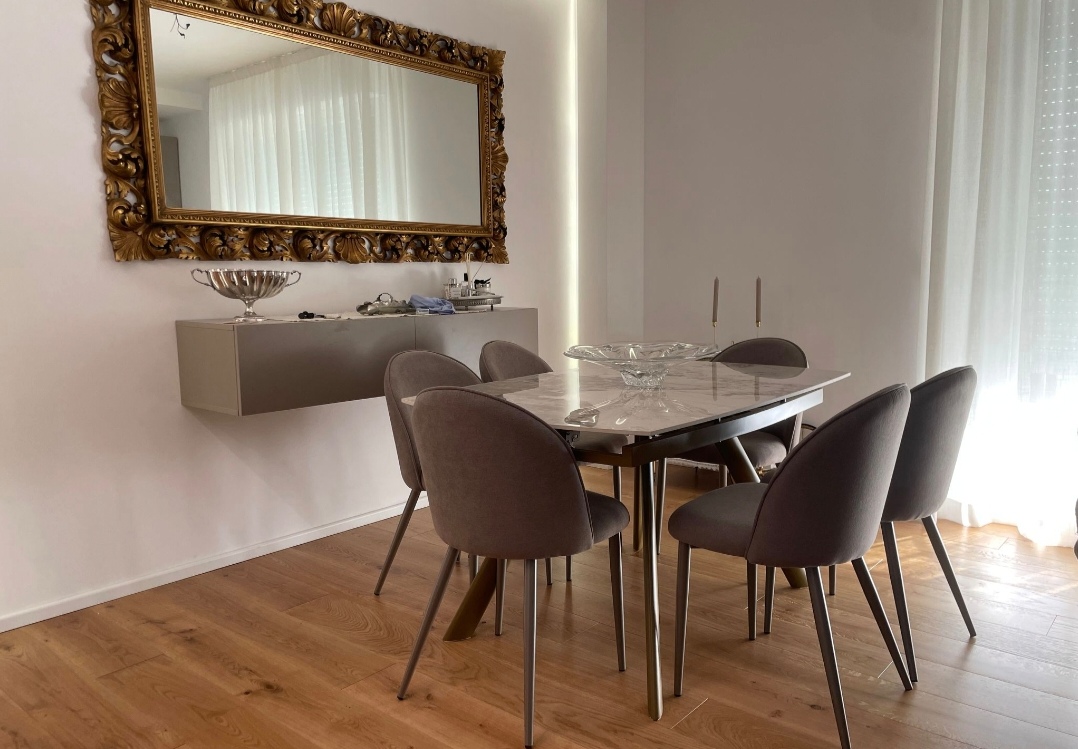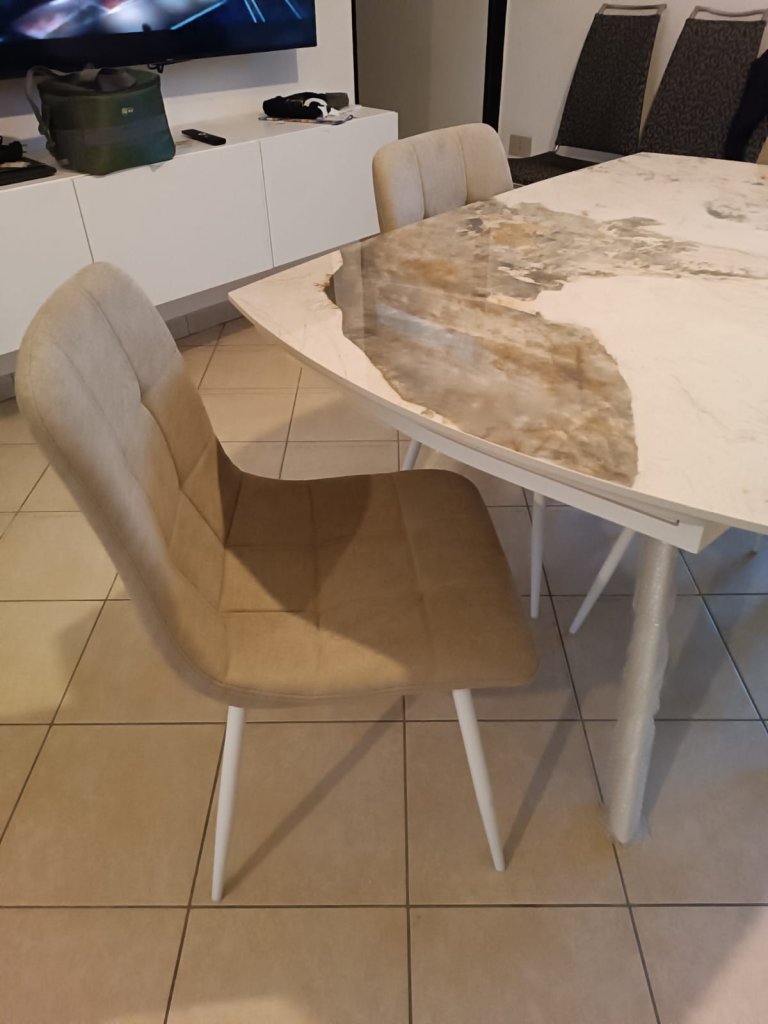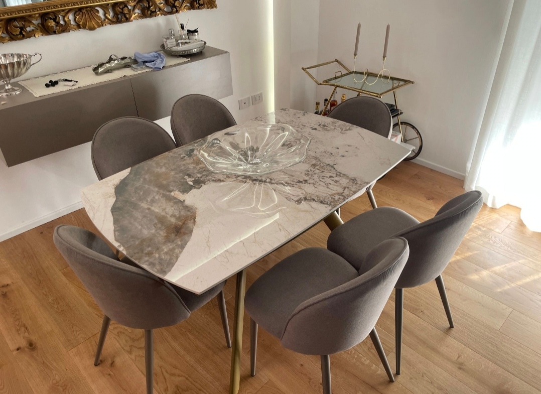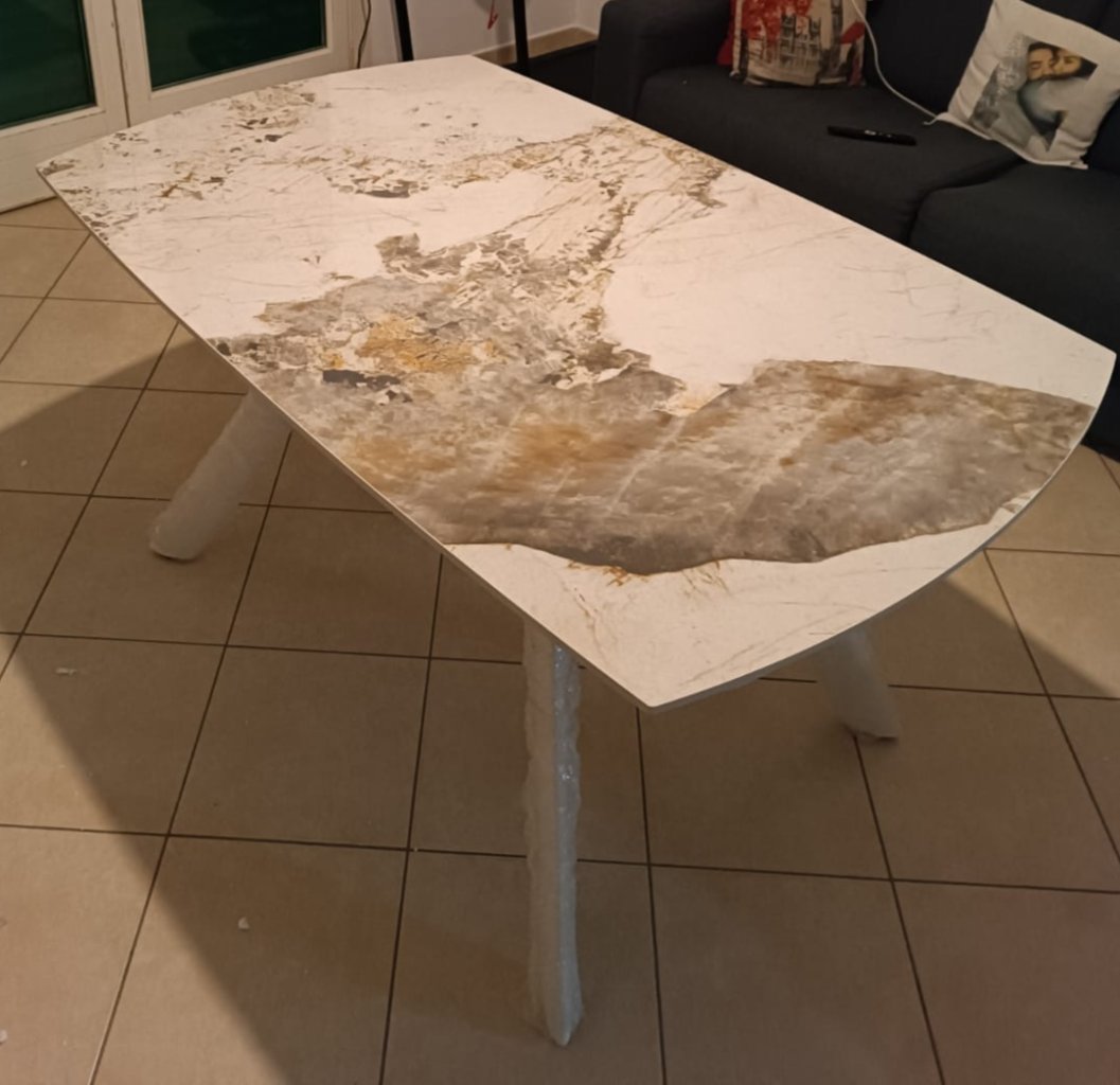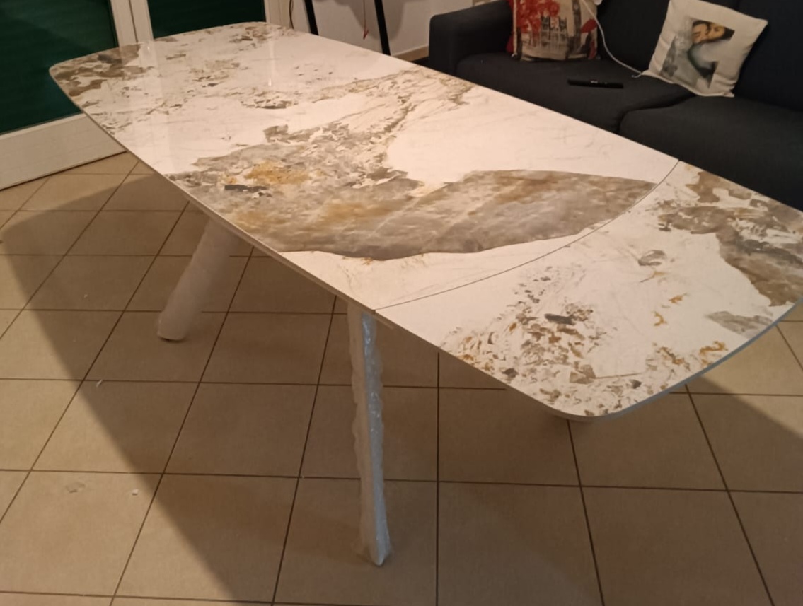 Tavolo allungabile con due allunghe da 35 cm; base in metallo verniciato e piano in pietra sinterizzata effetto marmo.