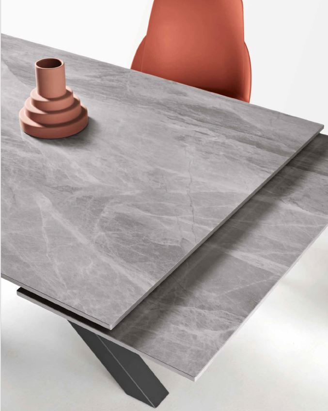 Tavolo allungabile con 2 allunghe laterali da 40 cm. Base in metallo verniciato e piano in pietra sinterizzata effetto marmo.