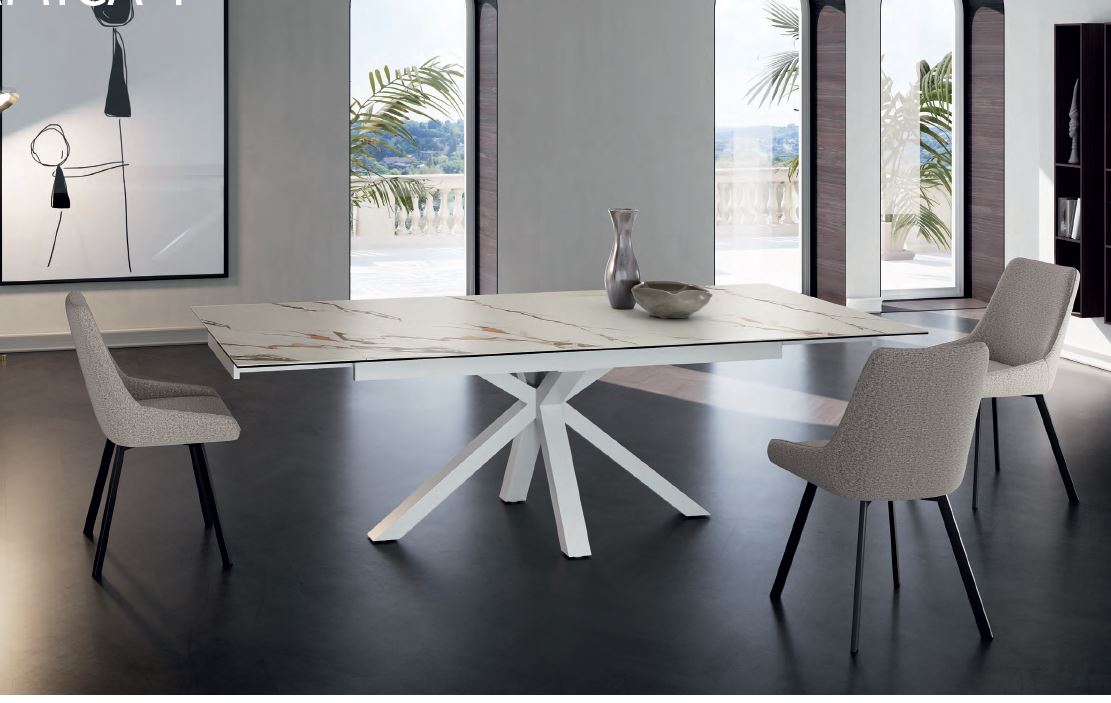 Tavolo allungabile con top in ceramica marmo Calacatta Borghini OPACO. Base in metallo verniciato bianco.