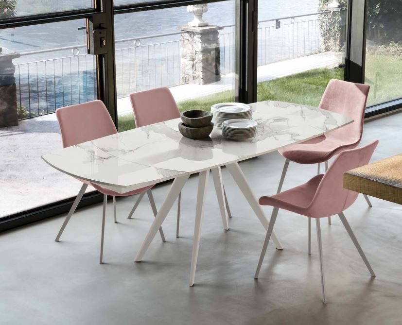 Piano a botticella con sistema di apertura semiautomatico, in vetro o grès porcellanato. Disponibile in due misure: 130, che si allunga fino a 200 cm, e 160, per arrivare a 240 cm.